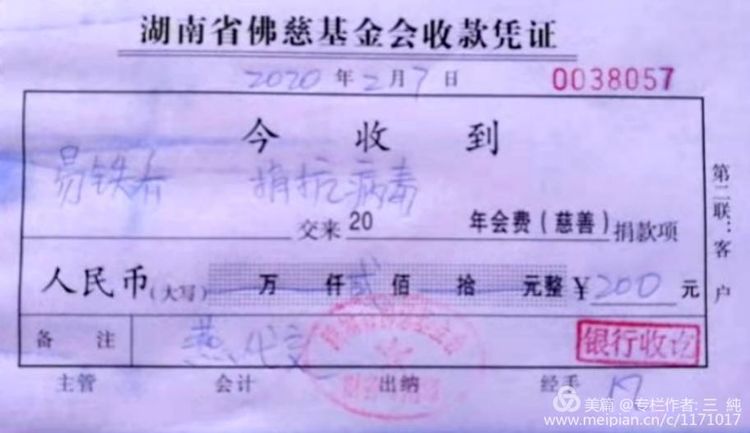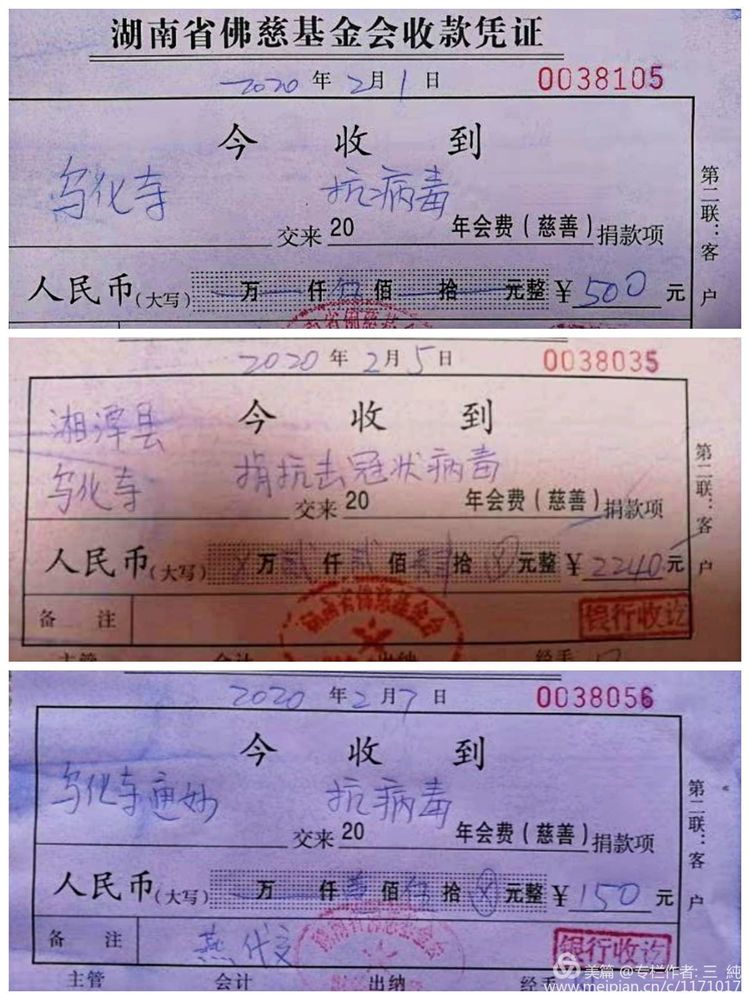 2020年元月,全國爆发了新冠肺炎疫情,为打赢这场抗"疫"阻击战,响应省宗教部门抗灾赈灾的精神号召,湘潭县乌化寺主持上通下妙法师舍小家为国家。自已在承建的"大雄宝殿、寮房、道路"及基本建设资金极其艰难条件下,毅然向湖南省佛慈基金会(简称: 省佛慈会)捐款3290元……愛心没有大小,守望相助佑中华。