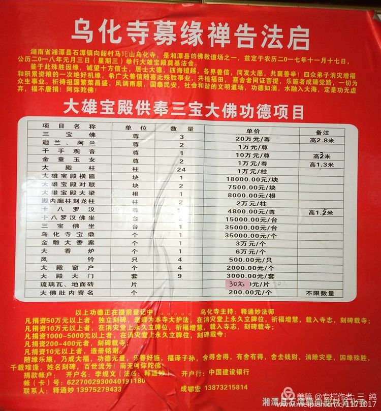 今天,乌化寺大雄宝殿基础建设、寮房、道路初现一点成效,是在各级党政领导和县佛协关怀、支持之下,同时也仰仗各位父老乡亲、法师、四众弟子增砖添瓦,捐款捐物及以一如既往地关心、帮助和护持是分不开的。